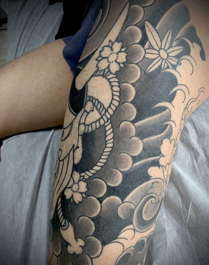 当前位置: 首页 >山西省晋城市纹身店-三晋彫蜃刺青处纹身图案>花腿黑灰纹身图片_腿部老传统纹身图案