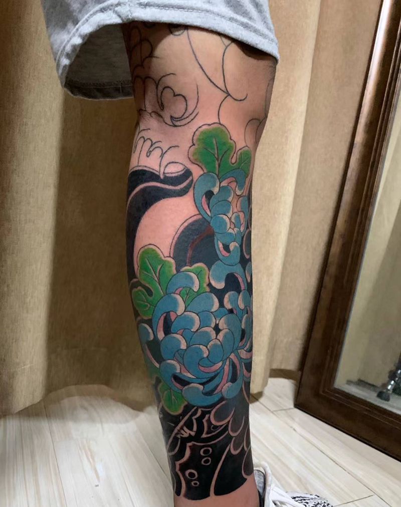 当前位置: 首页 >山西省晋城市纹身店-三晋彫蜃刺青处纹身图案>花腿上色,线条非本人作纹身图片_腿部老传统纹身图案