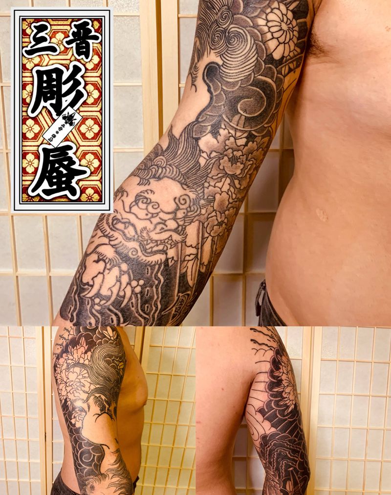 当前位置: 首页 >山西省晋城市纹身店-三晋彫蜃刺青处纹身图案>唐狮牡丹七分袖纹身图片_手臂老传统纹身图案