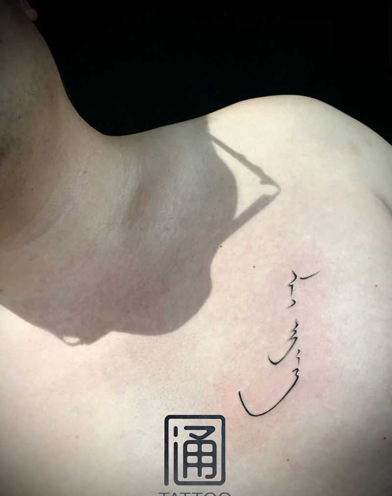当前位置: 首页 >山西省晋中市纹身店-通纹馆•私人纹身工作室纹身图案>情侣纹身纹身图片_胸部颈部花体字蒙语纹身图案