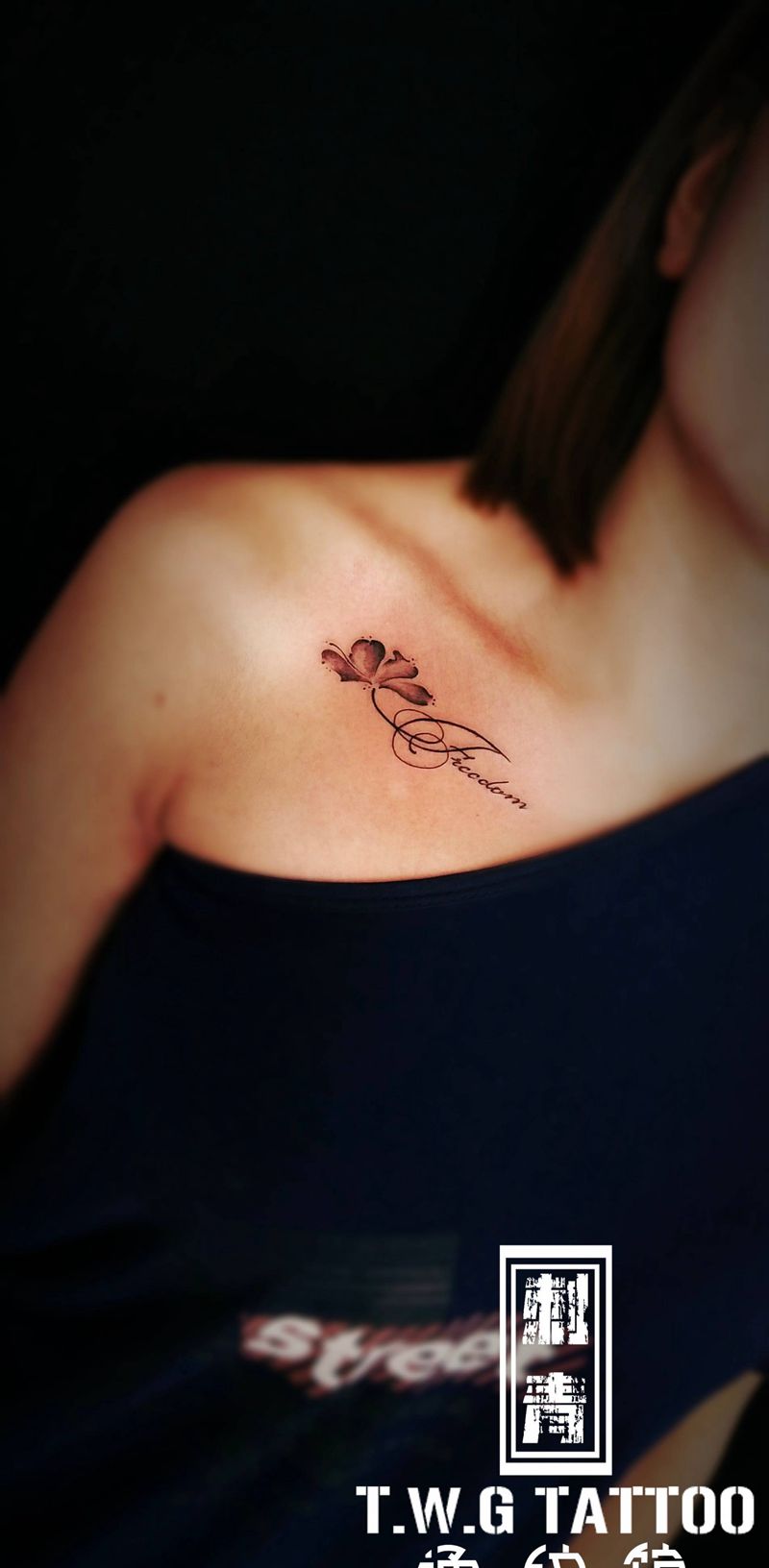 英文纹身图片_肩部颈部花体字英文:自由纹身图案