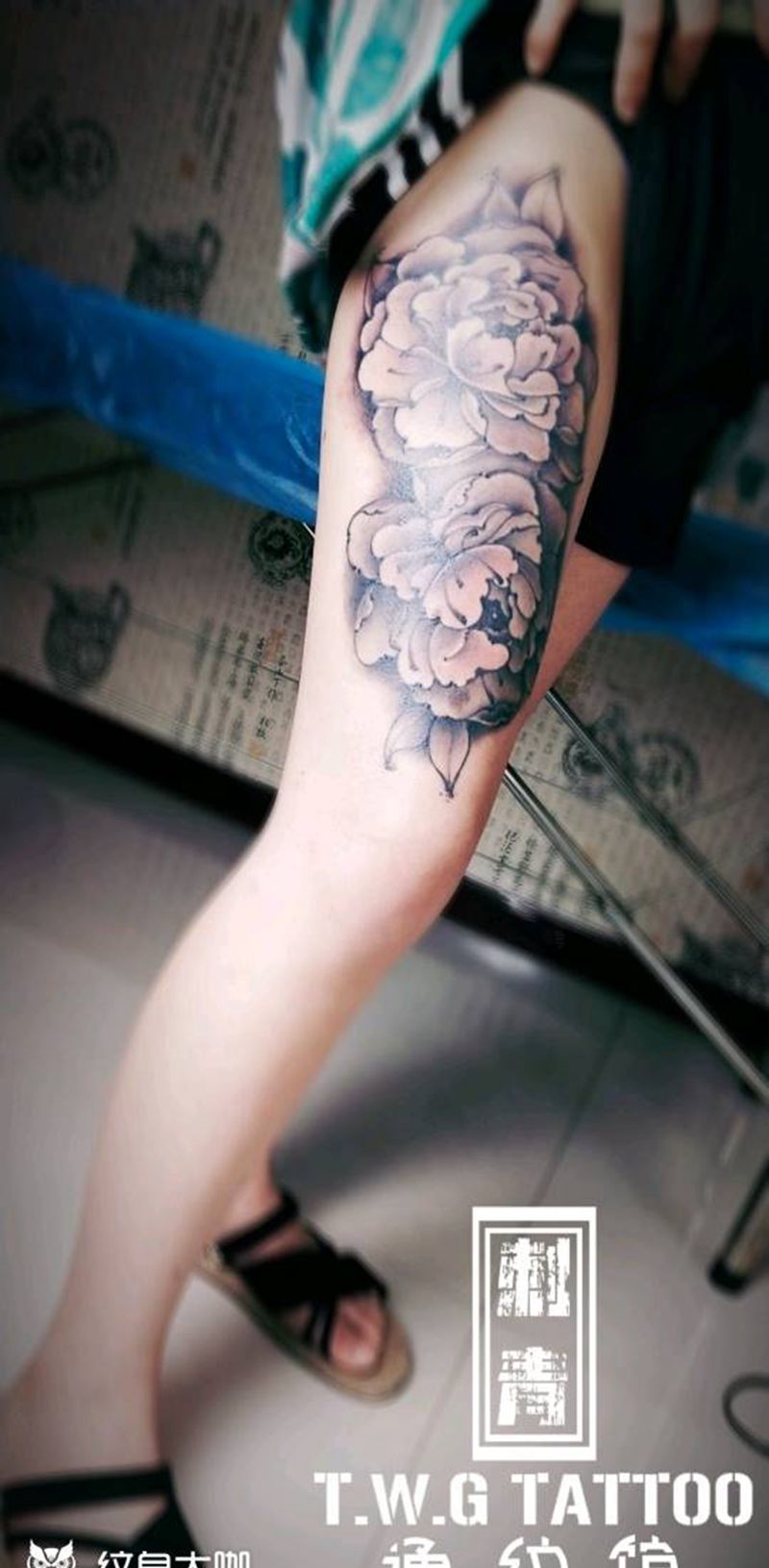 牡丹花纹身图片_腿部新传统牡丹花纹身图案