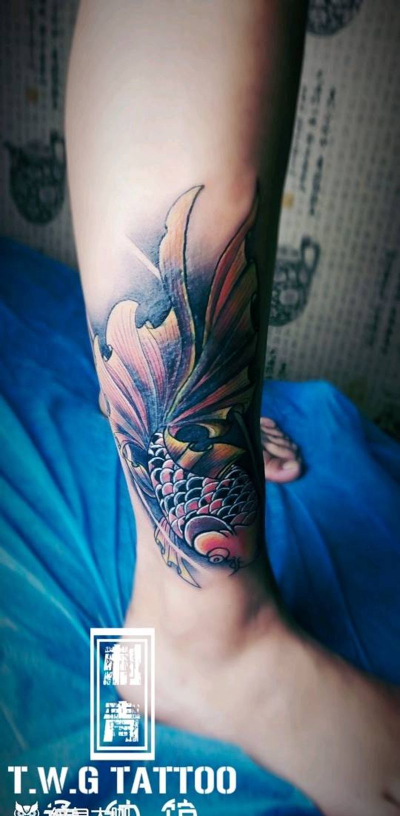 当前位置: 首页 >山西省晋中市纹身店-通纹馆•私人纹身工作室纹身图案>金鱼纹身图片_腿部新传统金鱼纹身图案