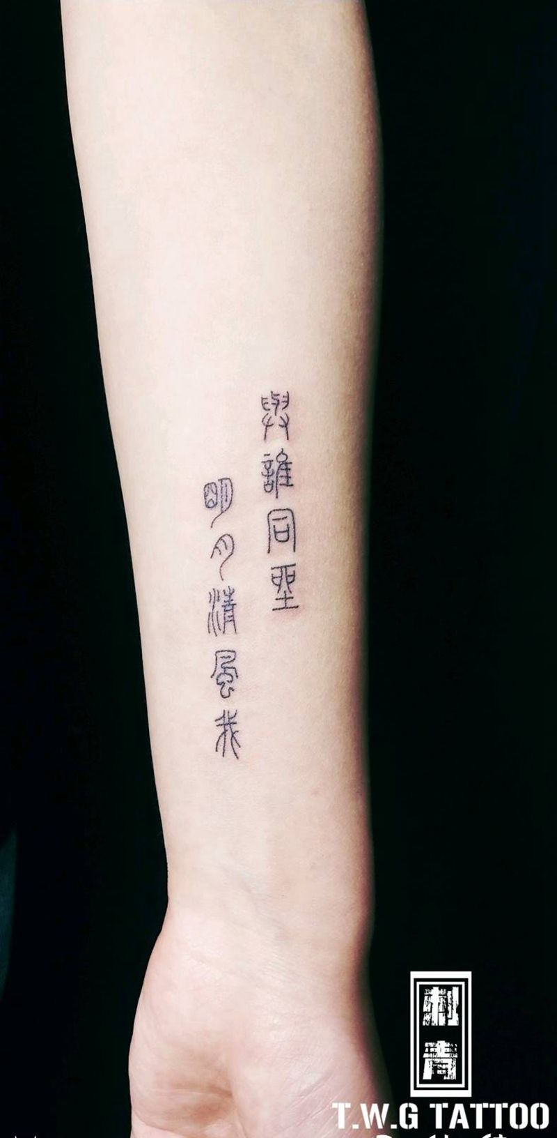 当前位置: 首页 >山西省晋中市纹身店-通纹馆•私人纹身工作室纹身图案>小篆纹身图片_手臂几何小篆字体纹身图案