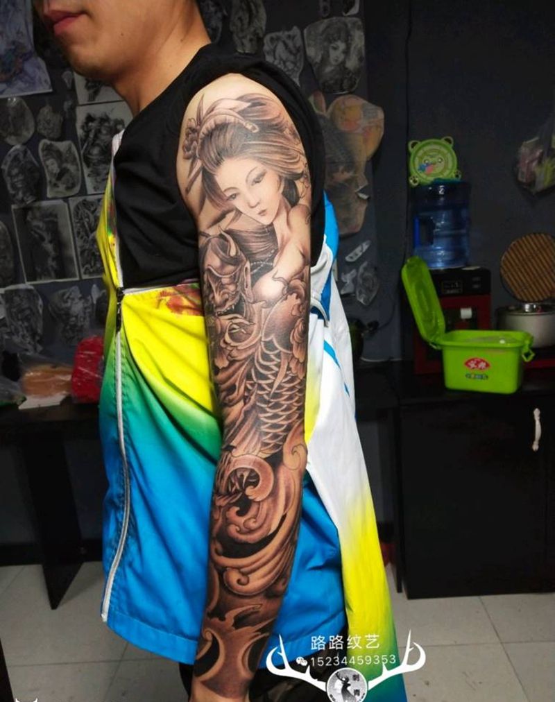 当前位置: 首页 >山西省晋中市纹身店-路路纹艺纹身图案>艺伎鲤鱼纹身图片_手臂纹身图案