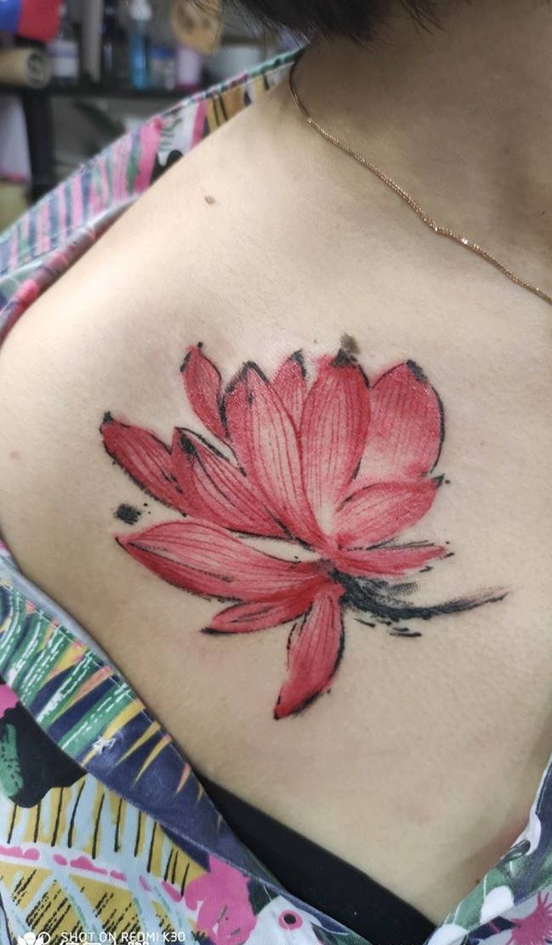 水墨小荷花纹身图片_胸部水墨纹身图案