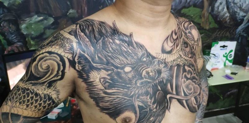 花胸龙头纹身图片_胸部纹身图案