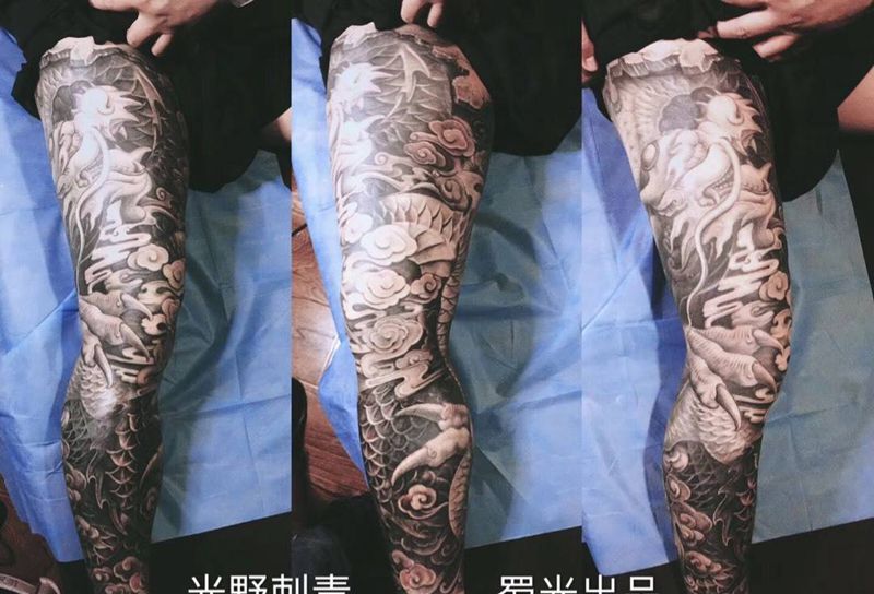 • T网红王老大花腿龙纹身图片_腿部新传统纹身图案