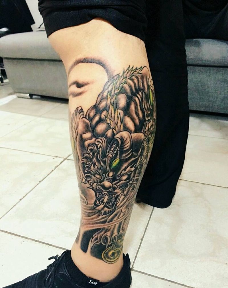 • T网红王老大花腿龙纹身图片_腿部新传统纹身图案