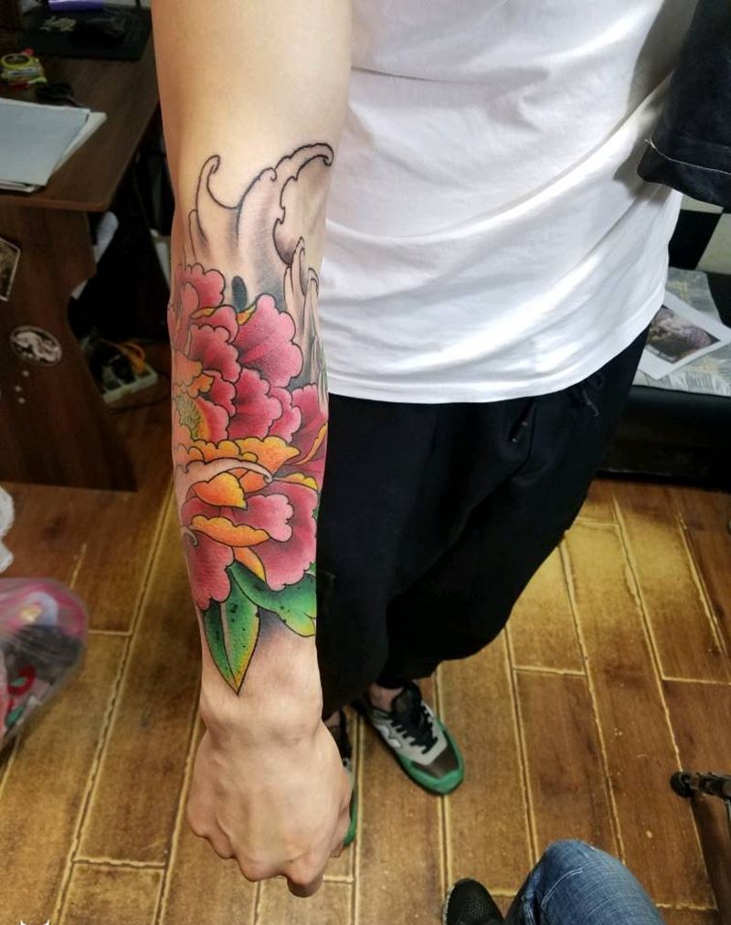 传统牡丹花纹身纹身图片_肩部背部手臂手部传统国画字符人物植物成品纹身图案