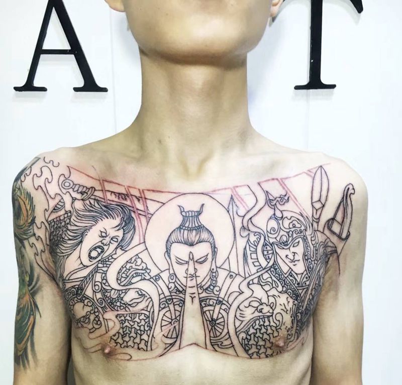 当前位置: 首页 >山西省运城市纹身店-运城-尊炎刺青纹身图案>花胸作品纹身图片_胸部新传统纹身图案