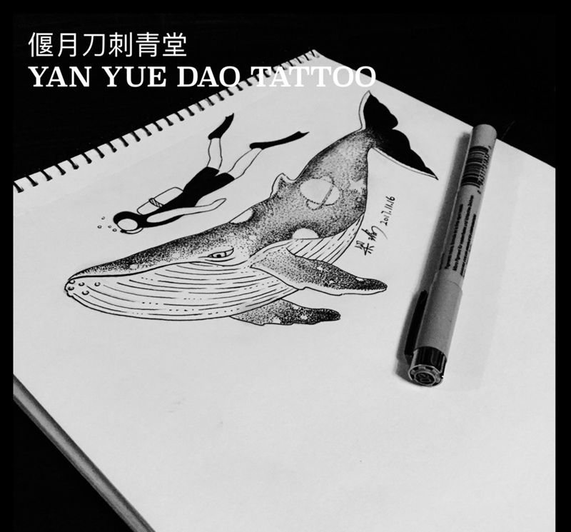 鲸鱼➕潜水员设计纹身图片_原创成品手稿手臂欧美点刺鲸鱼纹身图案