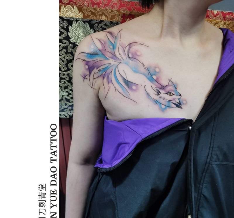 水彩九尾狐设计纹身图片_胸部水彩原创九尾狐纹身图案