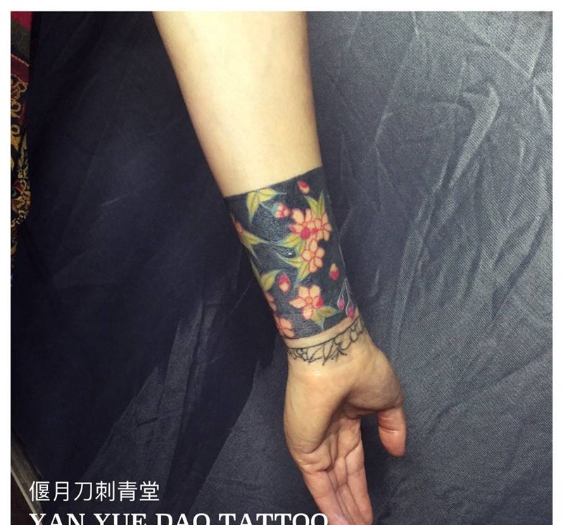 臂环樱花纹身图片_原创成品手部遮盖墨臂樱花纹身图案