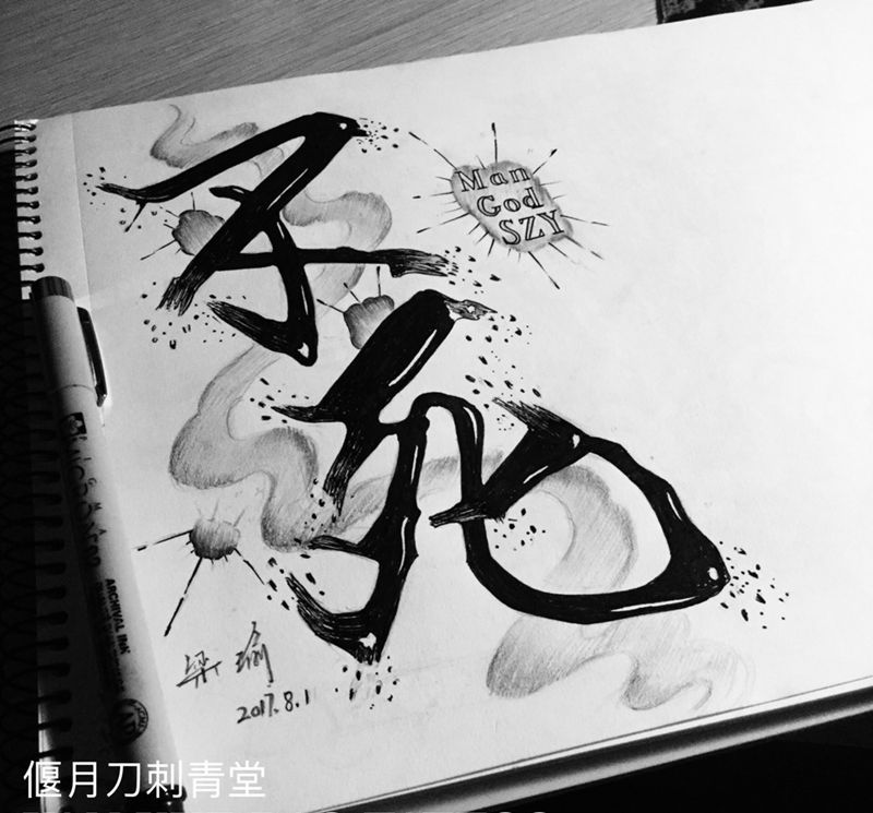 当前位置: 首页 >山西省运城市纹身店-偃月刀刺青工作室纹身图案>水墨字设计纹身图片_原创成品手稿水墨字纹身图案