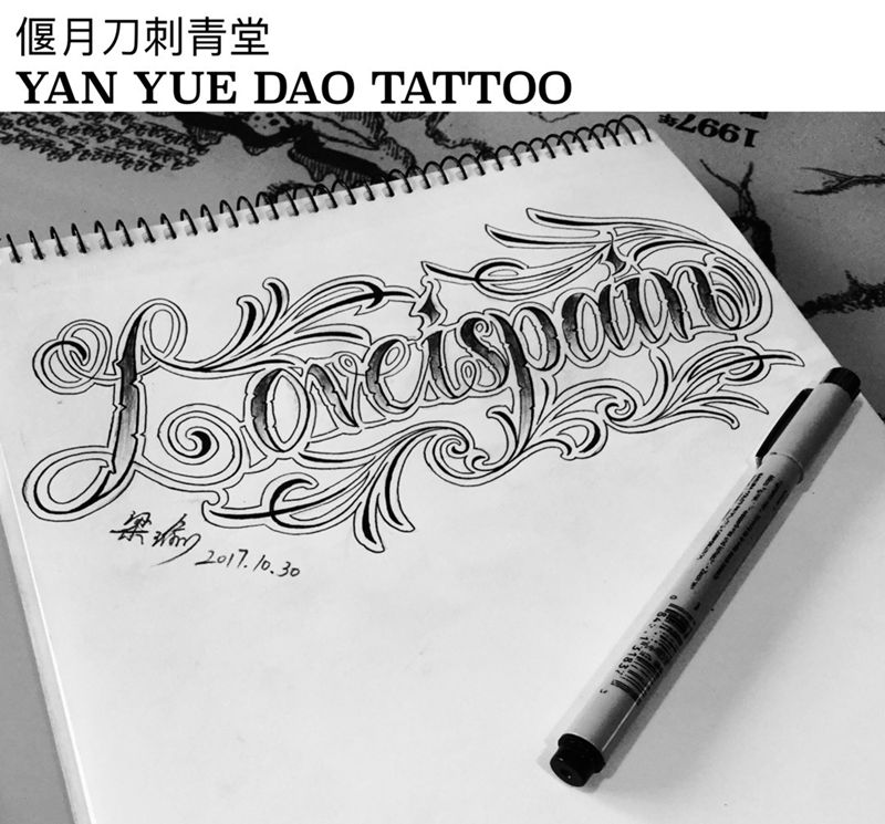 当前位置: 首页 >山西省运城市纹身店-偃月刀刺青工作室纹身图案>手绘花体字纹身图片_原创成品手稿欧美手臂花体字纹身图案