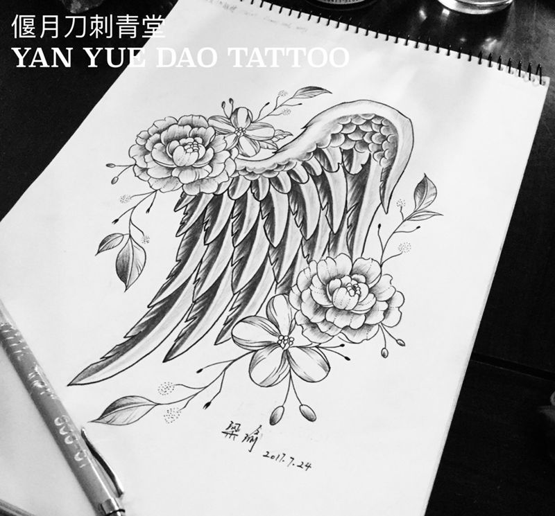 原创翅膀和花纹身图片_原创手稿成品手臂欧美翅膀花纹身图案