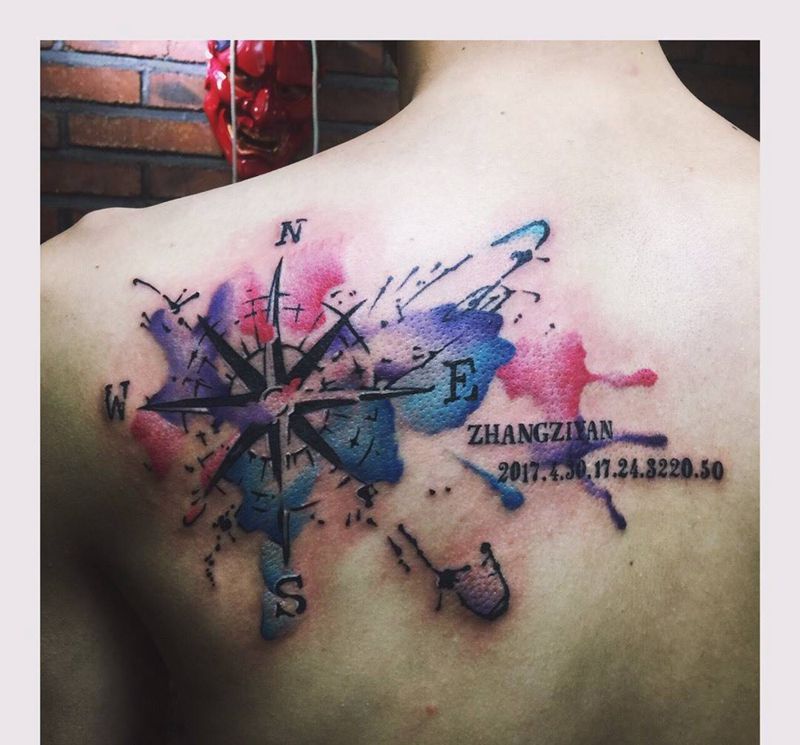 水墨指南针纹身图片_成品背部欧美原创纹身图案