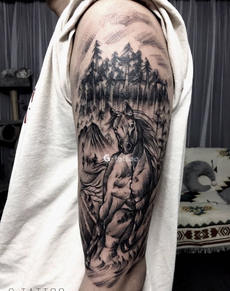 当前位置: 首页 >山西省临汾市纹身店-G·tattoo小盖刺青工作室纹身图案>马(遮盖)纹身图片_手臂欧美写实New School纹身图案