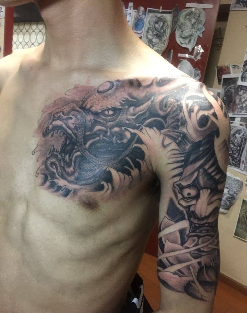 当前位置: 首页 >内蒙古呼和浩特市纹身店-蓝玫刺青纹身图案>龙头加般若半甲纹身图片