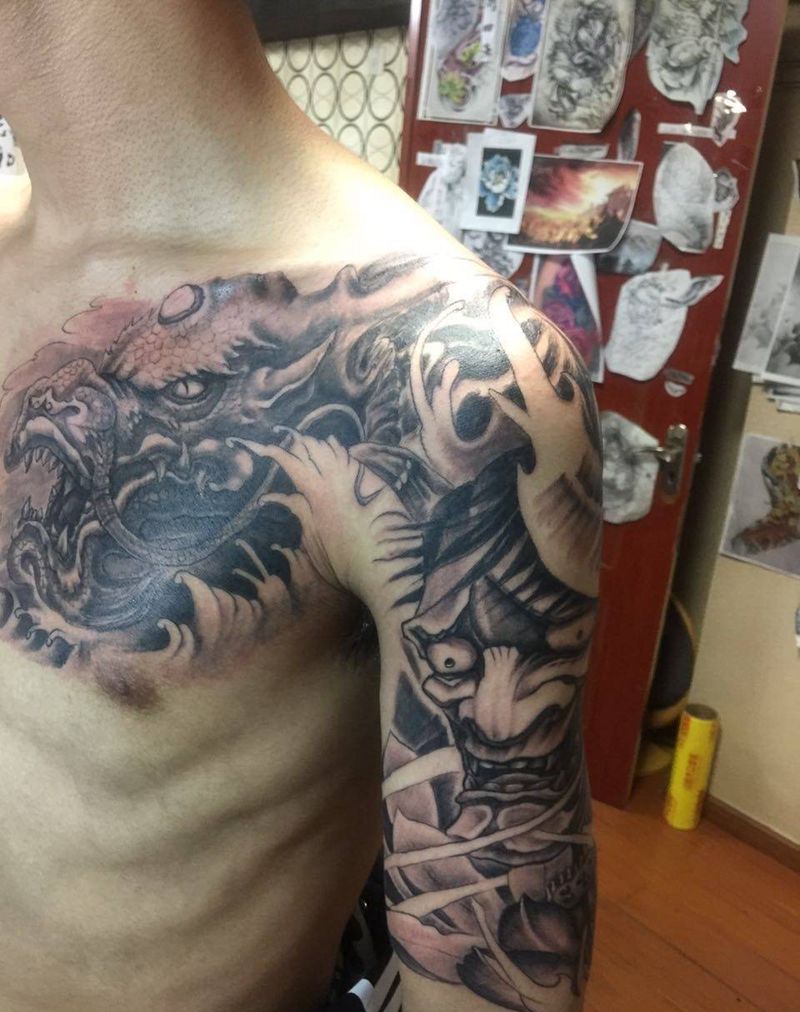 当前位置: 首页 >内蒙古呼和浩特市纹身店-蓝玫刺青纹身图案>龙头加般若半甲纹身图片