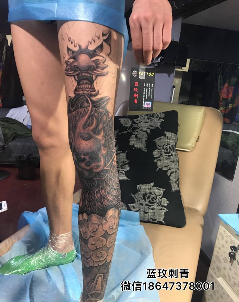 • T网红王老大花腿龙纹身图片_腿部新传统纹身图案