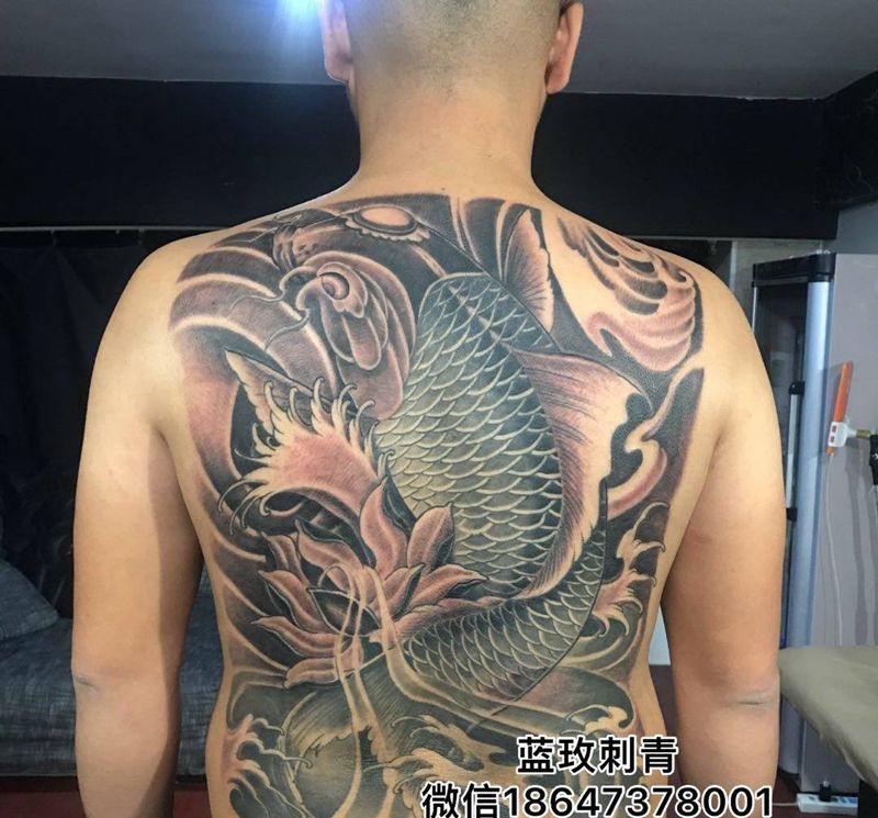 当前位置: 首页 >内蒙古呼和浩特市纹身店-蓝玫刺青纹身图案>满背鱼纹身图片