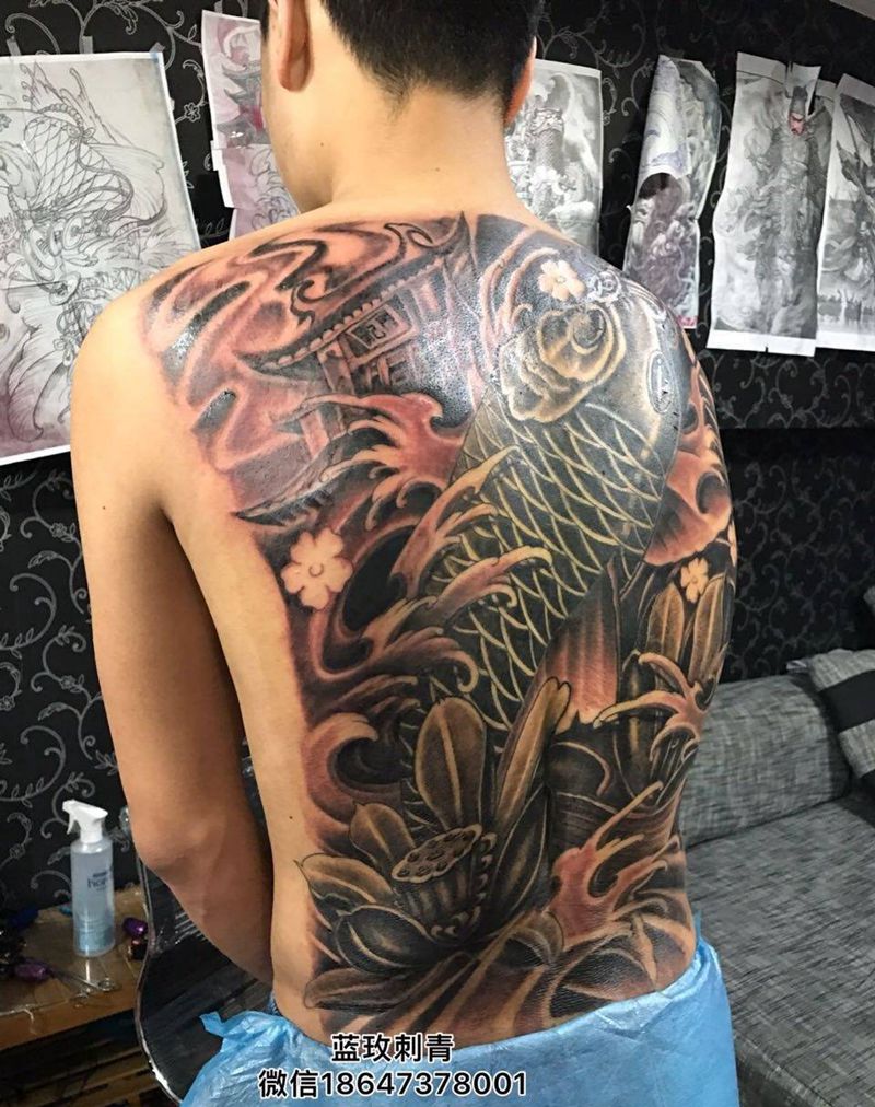 当前位置: 首页 >内蒙古呼和浩特市纹身店-蓝玫刺青纹身图案>满背鱼纹身图片