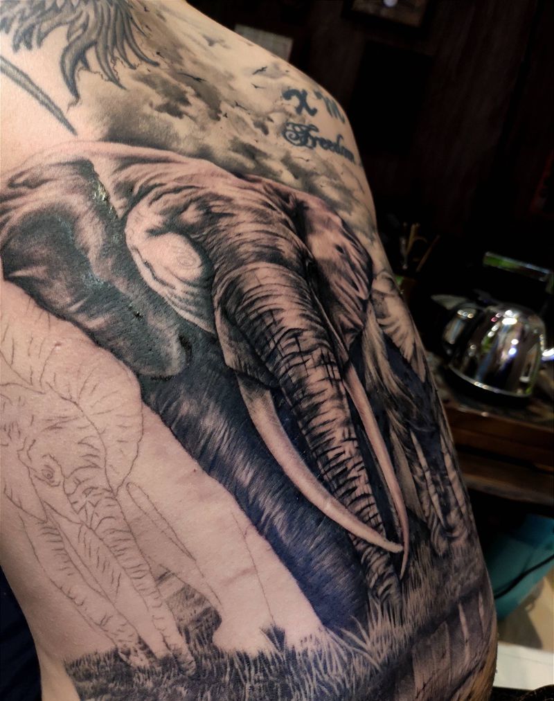 当前位置: 首页 >内蒙古呼和浩特市纹身店-巴依☆TATTOO纹身图案>满背象遮盖局部纹身图片_背部欧美写实大象遮盖局部纹身图案