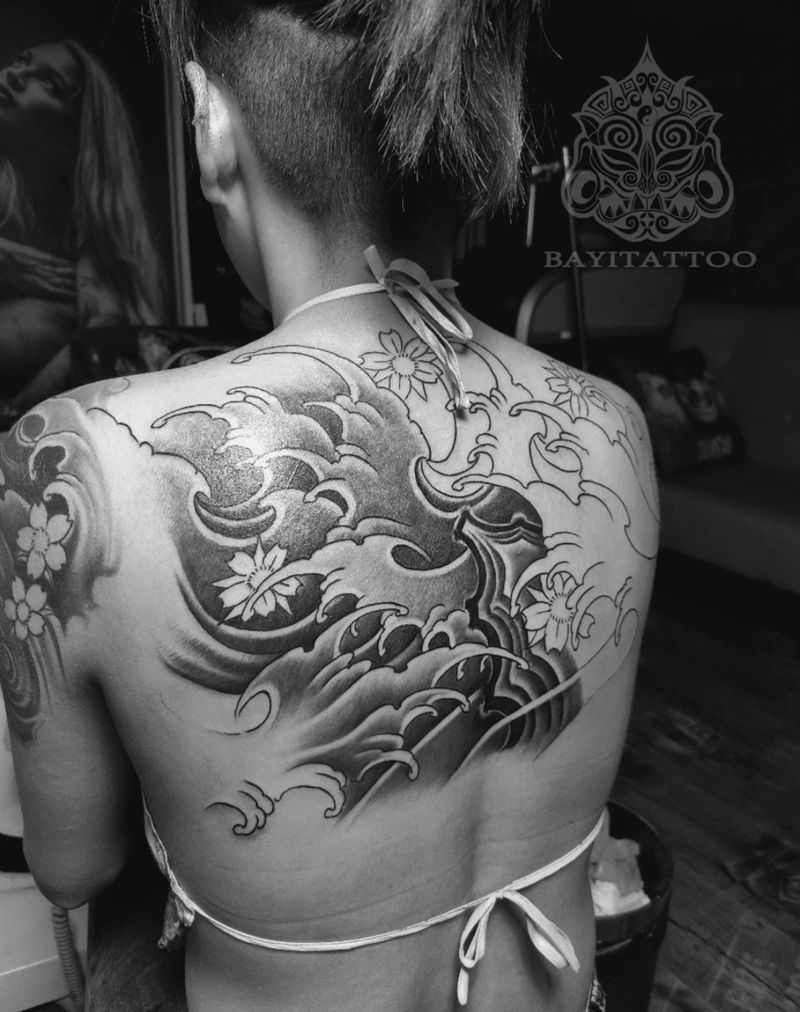 浪背(未完成)纹身图片_背部新传统浪花背未完成纹身图案