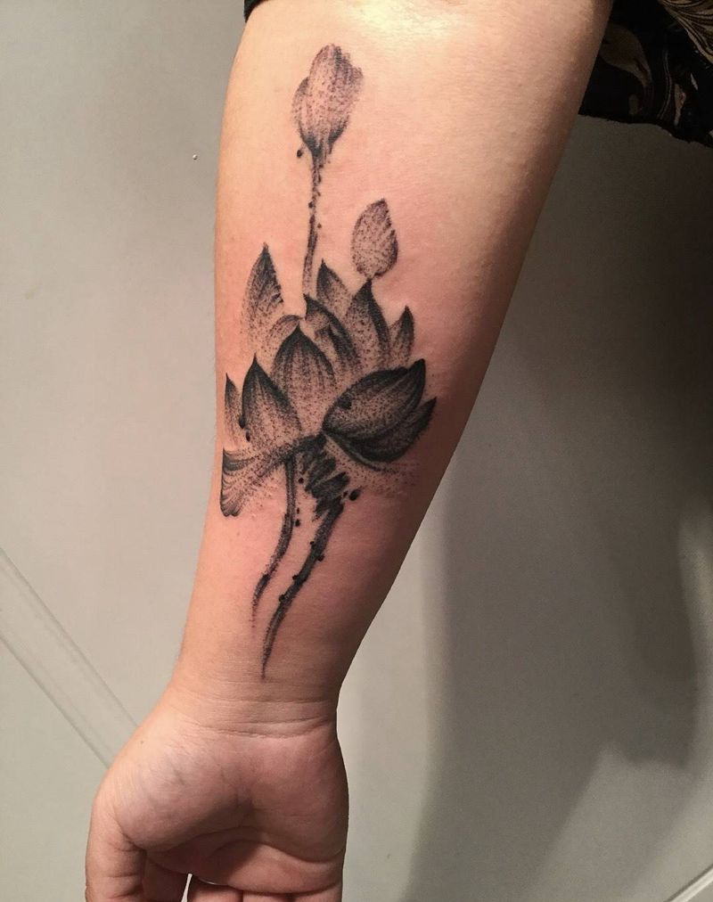 拉丝水墨莲花纹身图片_巴依纹身内蒙古纹身专业纹身手臂国画植物纹身图案