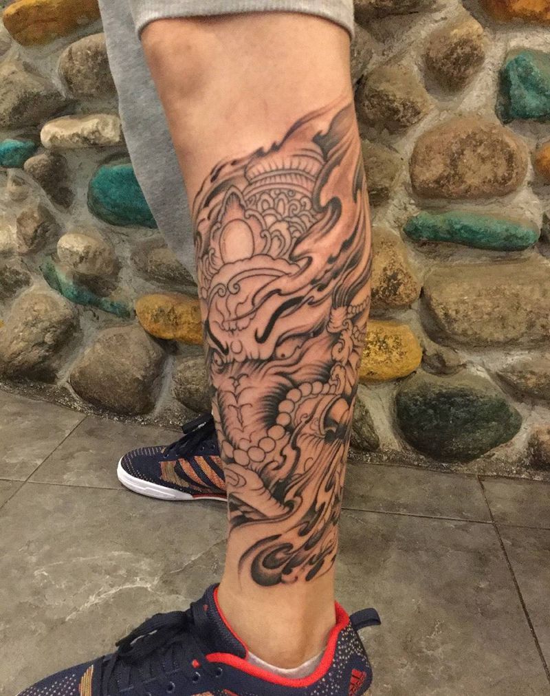 • T网红王老大花腿龙纹身图片_腿部新传统纹身图案