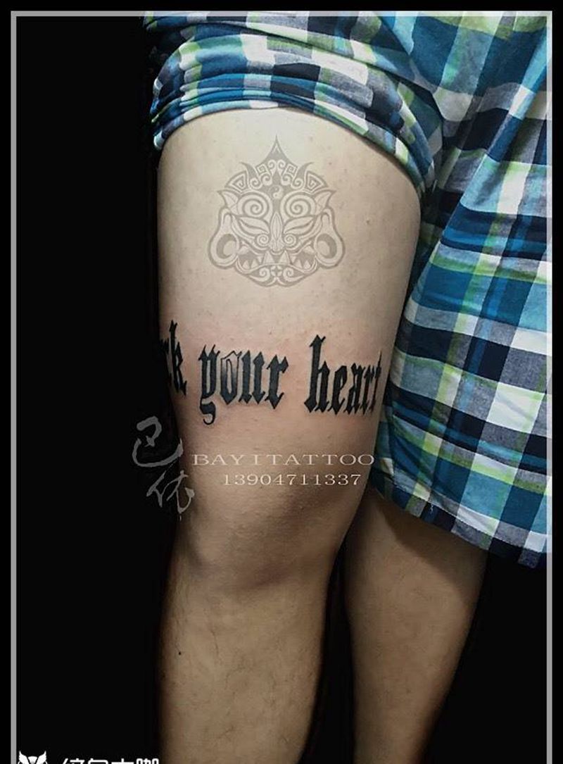 大腿哥特字纹身图片_巴依内蒙古专业培训腿部字符纹身图案