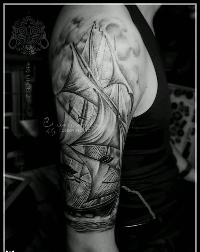 帆船纹身图片_肩部手臂欧美写实内蒙古纹呼市巴依纹身图案