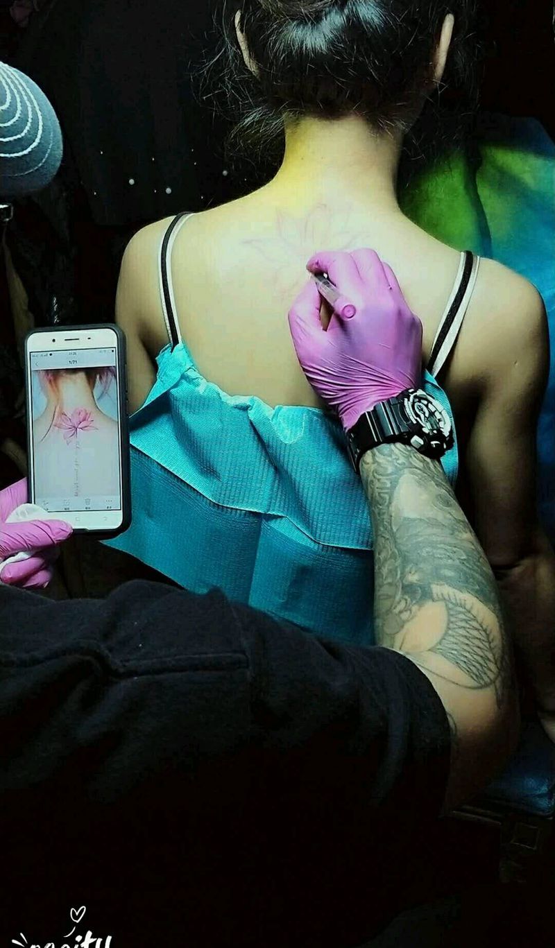 胡桃里现场作品→莲纹身图片_颈部国画静物内蒙古纹呼市巴依纹身图案