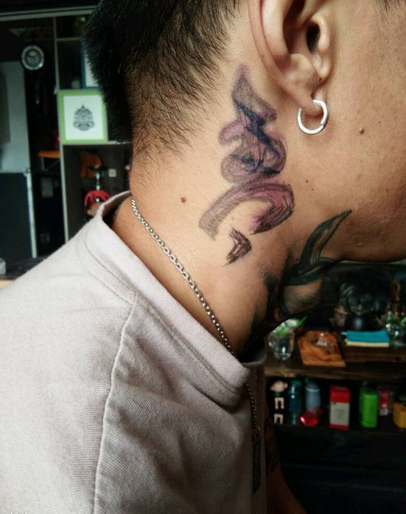 随意遮盖纹身图片_颈部水墨遮盖水墨字纹身图案