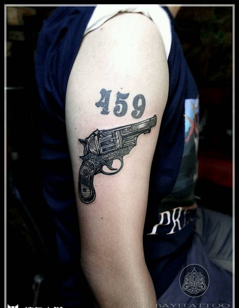 手枪纹身图片_肩部图腾手枪纹身图案