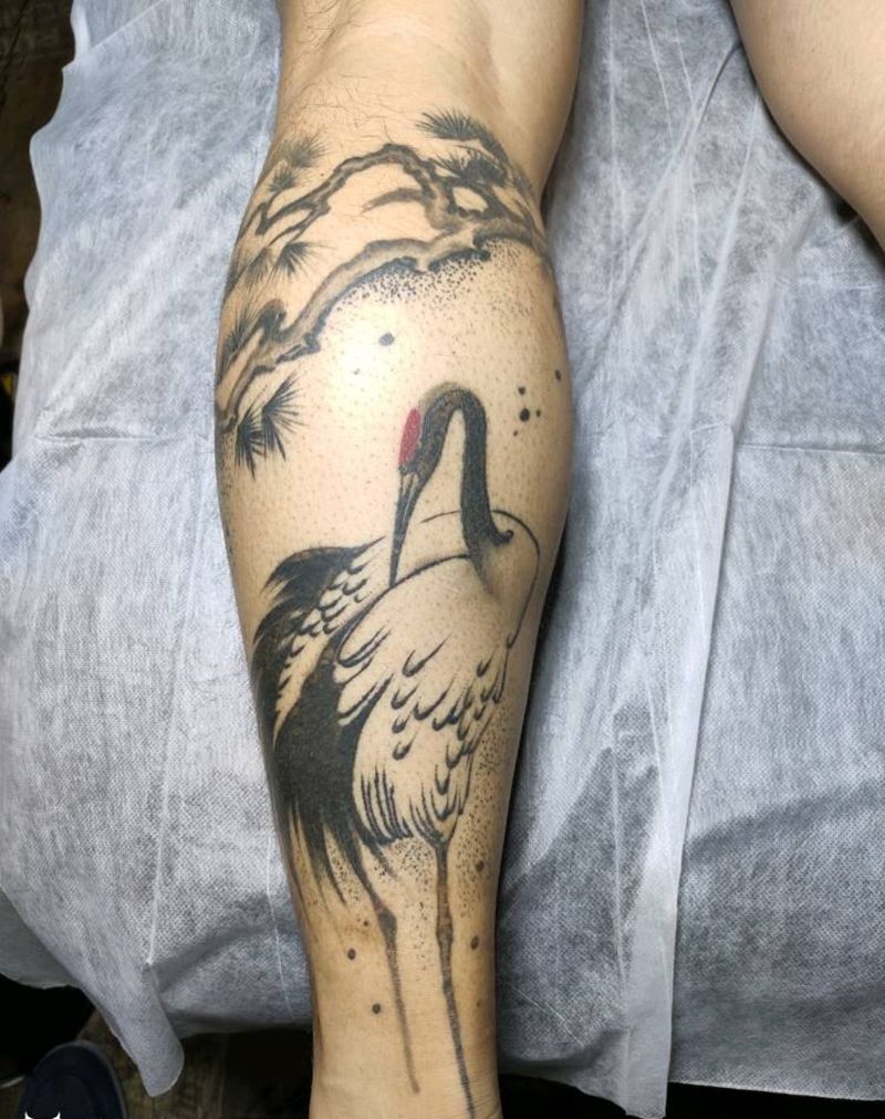 旧图修整纹身图片_腿部水彩水墨仙鹤修整纹身图案