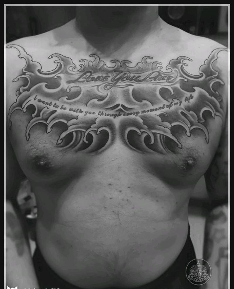浪花填充背景花胸纹身图片_胸部新传统浪花胸填充背景纹身图案
