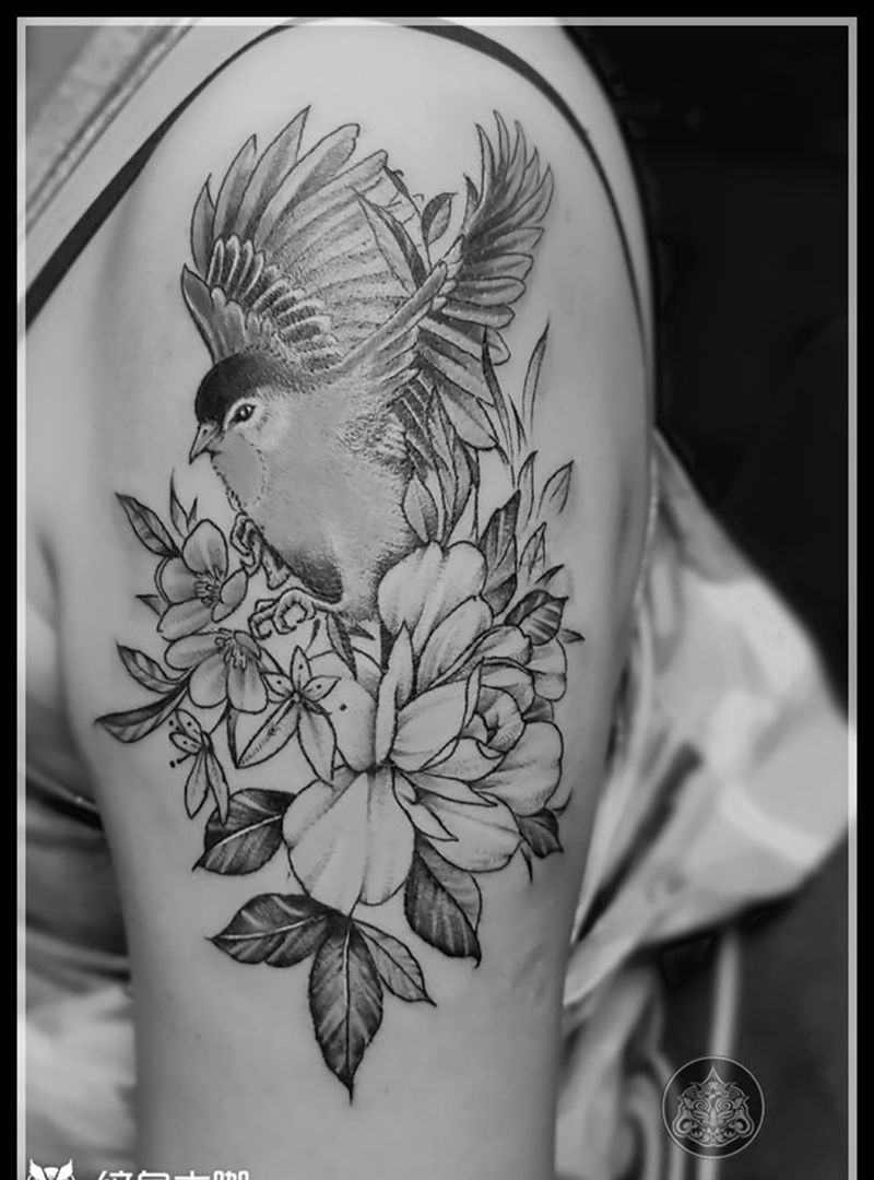 鸟与花纹身图片_肩部水彩鸟与花纹身图案