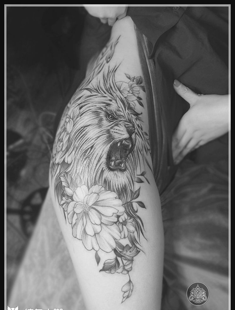 素花&狮子纹身图片_臀部腰部欧美写实素花狮子纹身图案