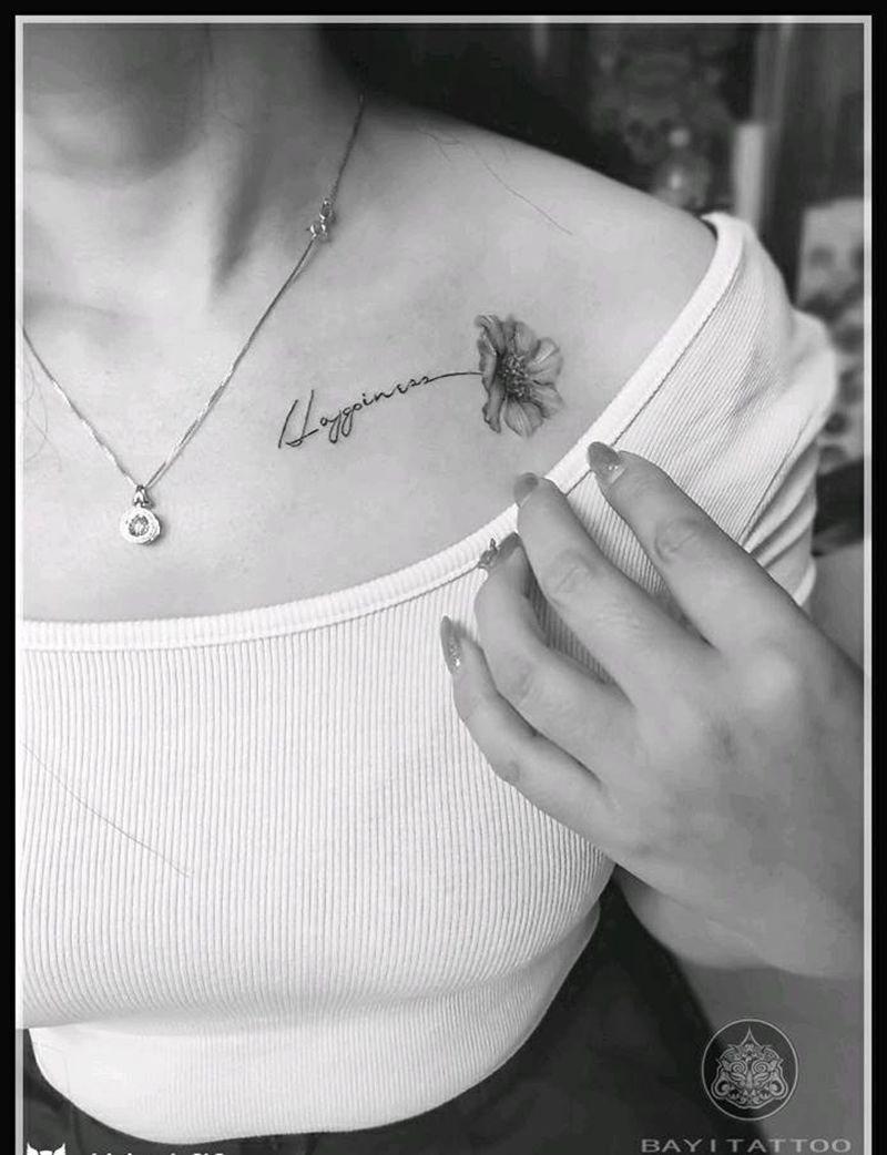 锁骨罂粟英文纹身图片_胸部水彩花体字锁骨罂粟花纹身图案