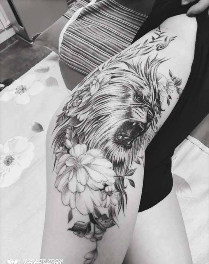 素花狮子买家秀纹身图片_腿部臀部欧美写实素花狮子纹身图案