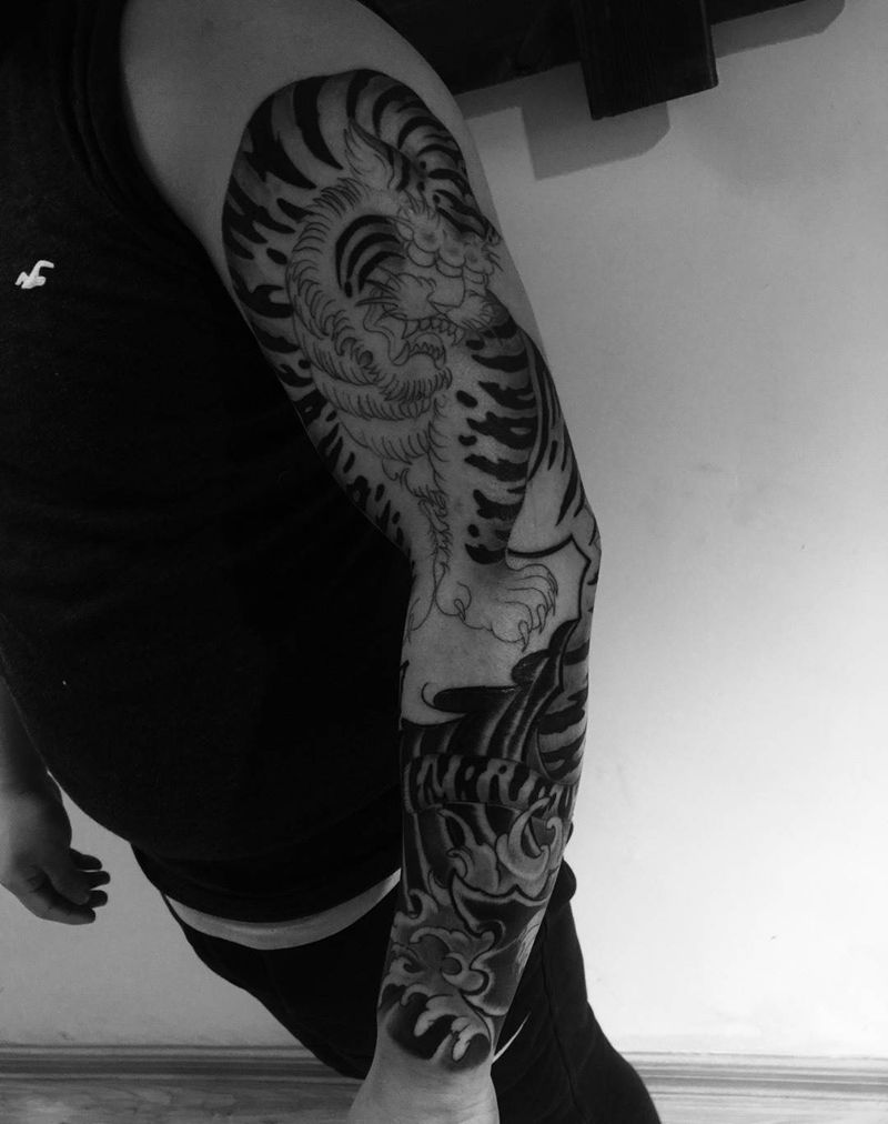 大猫进度 玄青tattoo纹身图片_动物传统手臂花臂刺青纹身图案