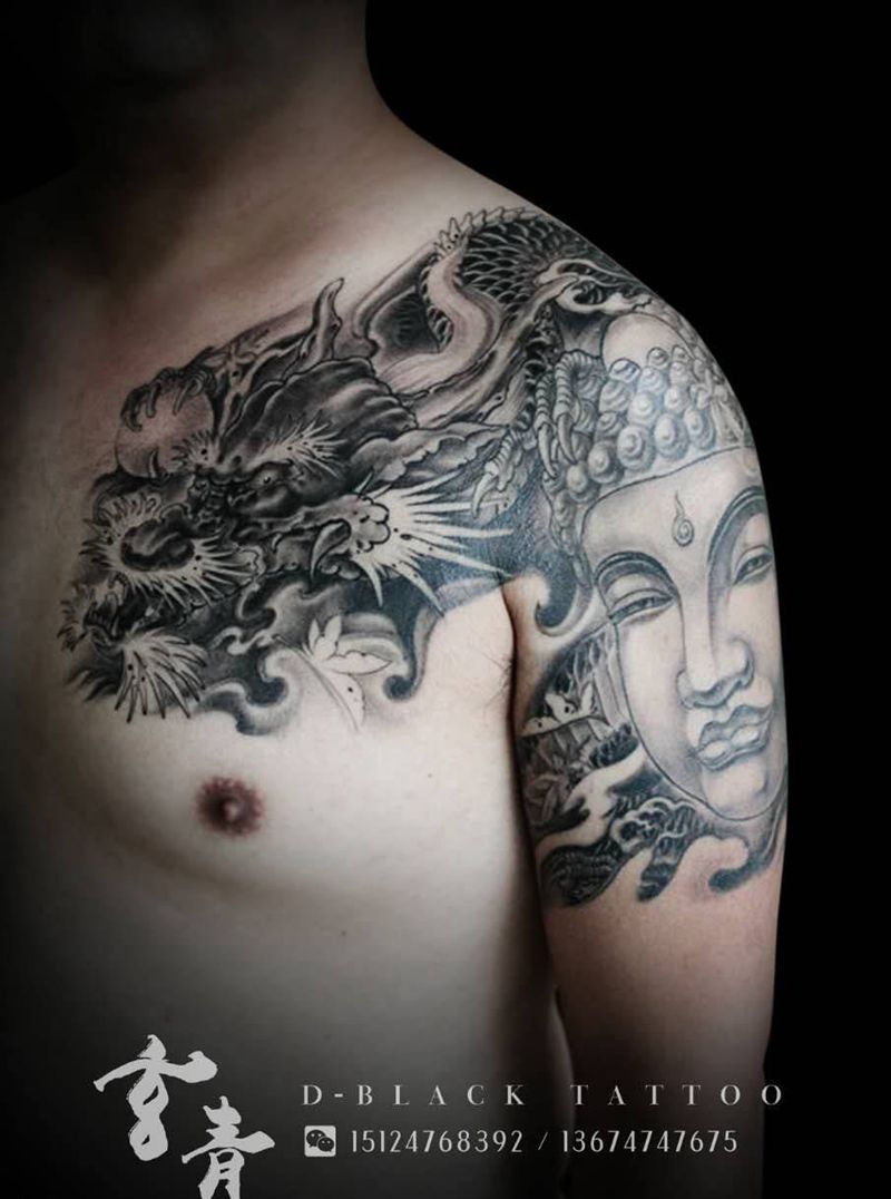 半甲纹身图片_传统胸部原创佛首刺青成品纹身图案