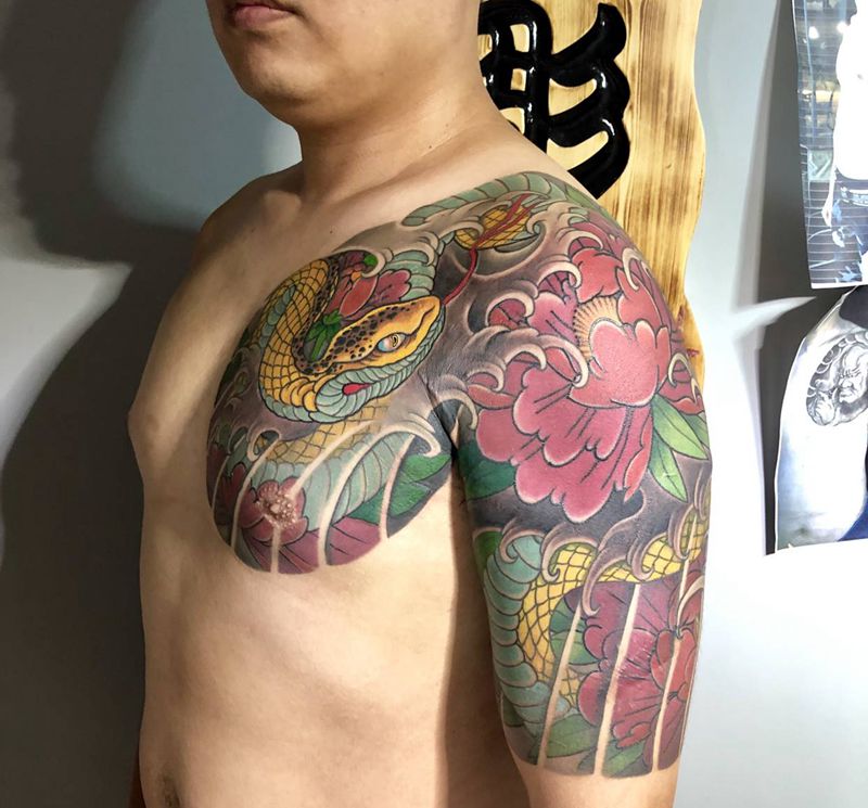 当前位置: 首页 >内蒙古呼和浩特市纹身店-玄青Tattoo纹身图案>彫國作品 半甲蛇纹身图片_胸部老传统新传统纹身图案