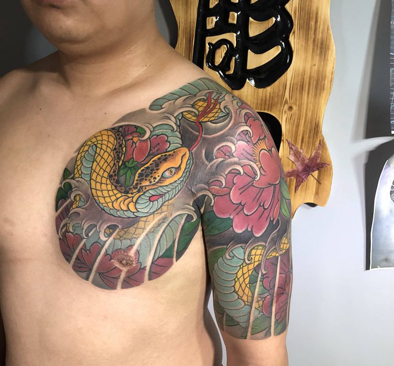 彫國作品 半甲蛇纹身图片_胸部老传统新传统纹身图案