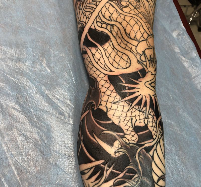 • T网红王老大花腿龙纹身图片_腿部新传统纹身图案