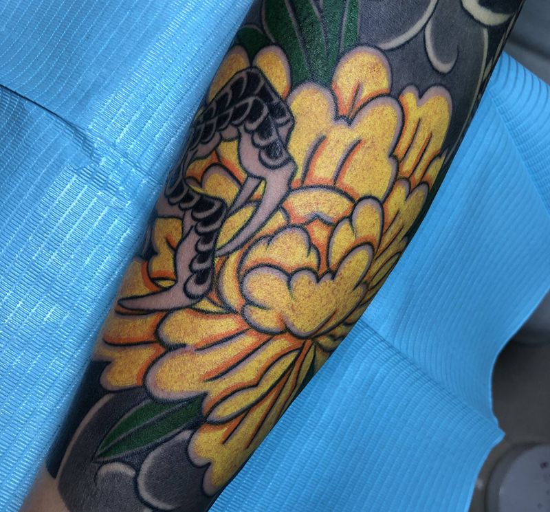 当前位置: 首页 >内蒙古呼和浩特市纹身店-玄青Tattoo纹身图案>两条龙臂上的牡丹花纹身图片_手臂手部老传统新传统纹身图案