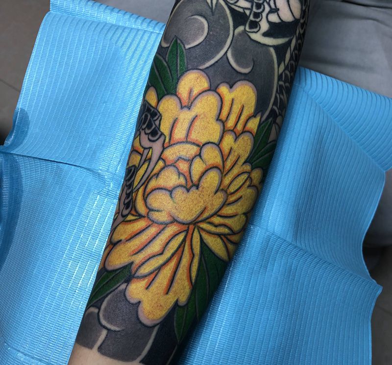 当前位置: 首页 >内蒙古呼和浩特市纹身店-玄青Tattoo纹身图案>两条龙臂上的牡丹花纹身图片_手臂手部老传统新传统纹身图案